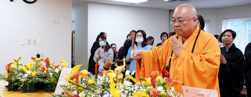 浴佛法會由溫哥華道場監院常悟法師親臨主法。參加法會的大眾非常踴躍,從稚齡的小菩薩們至近百的老菩薩們一起齊聚大殿浴佛浴心。